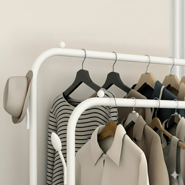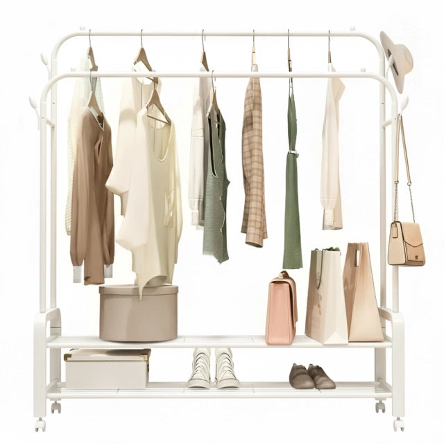 Su estructura de doble barra permite colgar gran cantidad de prendas mientras los estantes inferiores ofrecen espacio extra para calzado o accesorios.